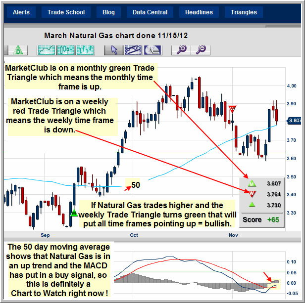 The monthly MarketClub Trade Triangle for Natural Gas is green which means the long-term trend is up.