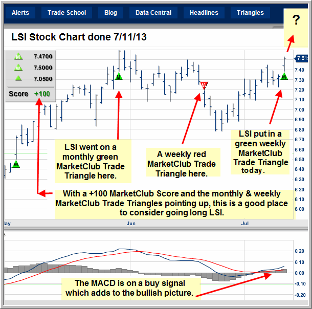 This week let's take a look at how the LSI stock chart looks with the MarketClub Trade Triangles.