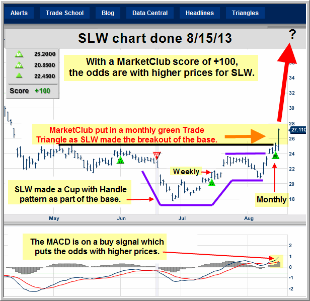 On the breakout of the base SLW put in a monthly MarketClub green Trade Triangle, and as of right now all 3 Trade Triangles are green which puts the odds with higher prices.