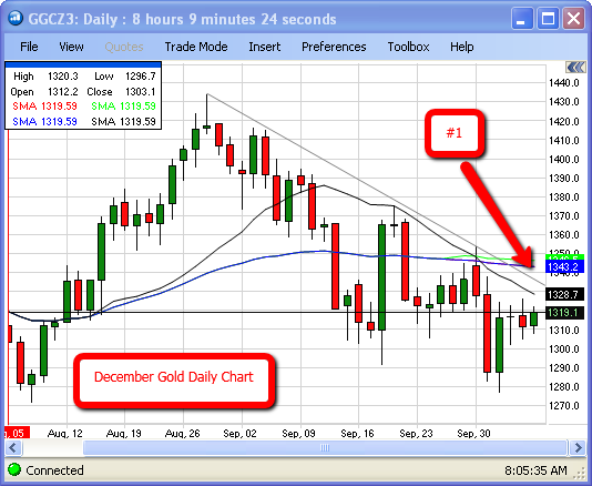 So far this morning, the December Silver Futures are already testing resistance, while Gold is only a few points behind. The chart of December Gold points out the resistance trendline (arrow#1) that Gold is slowly approaching. If over the next few days, Gold can find a way to close above this point, prices should be headed toward $1350, which is the next key resistance. Closes above $1350 would be a bullish sign for this Futures Contract.