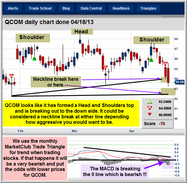 QCOM is currently on a red weekly MarketClub Trade Triangle. If QCOM continues lower and puts in a green monthly MarketClub Trade Triangle that will be bearish, as the weekly and monthly Trade Triangles will be pointing to lower prices.